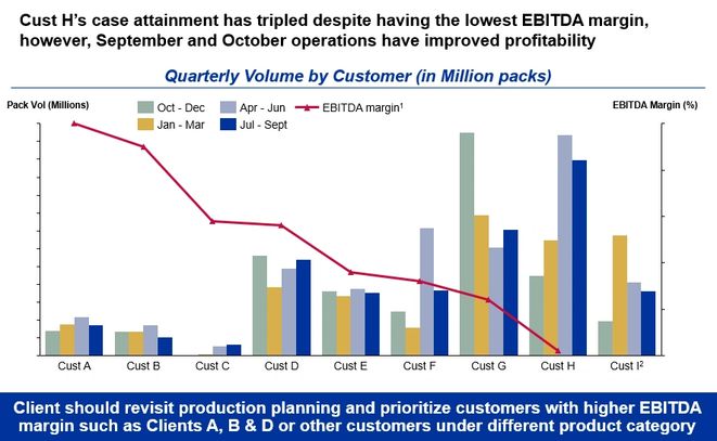 With our guiding principles in place, we set out to determine profitability at the customer and SKU level. The client had been prioritizing its largest customer by volume, contributing ~30% of the plant’s total volume. However, after incorporating setup and changeover times, asset intensity, intercompany transfers and additional activities dictated by customer behaviors, we discovered this “key customer” was actually EBITDA destroying (see figure 1 below). While the largest customer’s volume helped absorb some fixed costs, any volume would have done that given the backlog. The client was better off selling to similar customers that would pay a higher unit price. Given these more profitable alternative options, we recommended shifting prioritization towards the higher-performing SKUs, while increasing price on this portfolio dilutive customer.