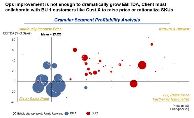 In addition to analyzing activities across customers and SKUs, we also honed in on profitability across the client’s facility. The facility was segmented into 2 business units, with ~80% of the client’s revenue coming from BU1. Naturally, the client had allocated a significant portion of its investment and strategic focus to BU1. However, BU2 was significantly more profitable, driving >100% of the company’s EBITDA through ~20% of total revenue, with GM about 20% higher than BU1 (see figure 2). Until undertaking the ABC project, the client’s PE owner had no idea they owned such a “diamond in the rough”.