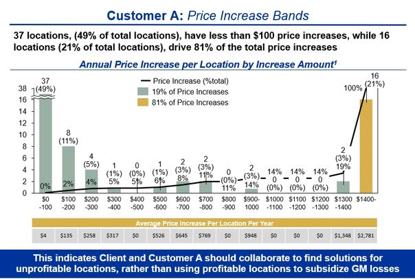 The issue of suboptimal customer locations diluting gross margins across a key customer banner has been a consistent problem for many of our clients. Similarly, we often see the reflex mechanism to stifle discussions on providing location-level pricing. The clients tell us the risk of losing multi-million dollar customers is too great. While certainly acknowledging the sensitivity of this scenario, we believe this challenge is difficult, but not insurmountable. In fact, if managed systematically, we’ve found tactics that can both enhance profitability, while strengthening customer relationships. After all, in what other area do customers prefer boiler plate options over customized, collaborative solutions? Here are a few methods we have employed to solve for the ‘free-loader’ problem: