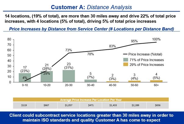 1. Segment the Data to Conduct Fact-Based Discussions: your customer may not be aware of the gross disparity in cost to service the full range of their sites. Your initial reaction might be “they don’t know and they don’t care”, but they might care if a collaborative approach could unlock better service. Consider building a profitability pareto similar to figure 1 below. From this chart, you can see that 16 locations (21% of total locations for this customer) are driving the bulk of the problem (81% of proposed price increases). Segment this data by any relevant parameters; in our case, we also examined profit versus driving distance (figure 2) due to the correlation mentioned above. We found that anything >40 miles is simply too far to drive and these sites should be investigated first if we are to drive improvement for all parties across the total value chain.